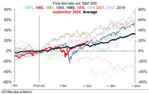 For the other eight observations (1974, 1980, 1981, 1984, 1989, 1995, 1998 & 2019), the S&P 500 was materially higher two years after the first rate cut. In the current cycle (bold red line), we are closely tracking the average of the ten observations (bold black line), approximately one year after the first reduction in interest rates (September 2024).