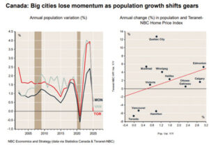 Growth in metropolitan areas has slowed from 3.6% in 2024 to 1.0% in 2025. However, population growth has slowed significantly less outside major cities (from 1.4% to 0.8%). If we examine population growth in Canada’s three largest cities, you will notice a significant slowdown in Toronto and Vancouver, where population growth has stalled.