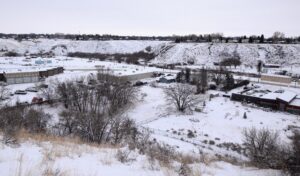 Medicine Hat Community Housing is proposing to build an affordable housing project on land located near Spencer Street between the city's fleet garage (shown left), the Canada Post distribution warehouse (centre) and the Albert Health Detox Centre (left). - New photo Collin Gallant