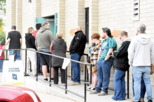 A lineup of voters is seen outside Holy Family Parish on Saturday during the first round of advance polls. Local electoral officials report more than 800 Hatters cast a vote throughout the day.--NEWS PHOTO BRENDAN MILLER