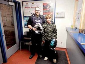 Cpl. Hagel of the Brooks RCMP, the responding officer, presents a new helmet to Gavin Watts of Brooks and thanks him for setting a positive example by wearing his helmet and practicing safe riding habits. The youth was recently struck by an SUV while riding his bicycle but staved off serious injuries due to wearing his helmet. -- SUPPLIED PHOTO