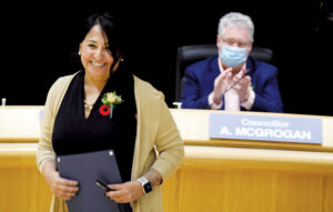 Shila Sharps was elected by a margin of nearly 1,500 votes in 2021, and lost by a margin of 2,000 in this year's election. She says she didn't realize how large the conflict between council, the mayor and the city manager loomed until she saw the discourse in the month leading up to the election. Sharps smiles after being sworn into office in this November 2021 file photo.--NEWS FILE PHOTO