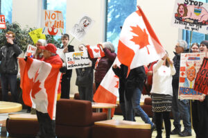 Attendees of the event were met by more than 80 protestors, many holding signs and wearing red and white, who peacefully sang the national anthem while holding the Canadian flag.