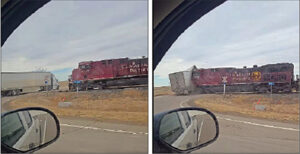 An online video making the rounds on social media captures the moment the train struck the trailer, which had stopped on the track crossing at approximately 2:20 p.m. on Highway 3 near Township Road 490.