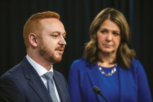 Minister of Justice Mickey Amery speaks in Edmonton on April 29, 2025 as Premier Danielle Smith looks on.--CP FILE PHOTO