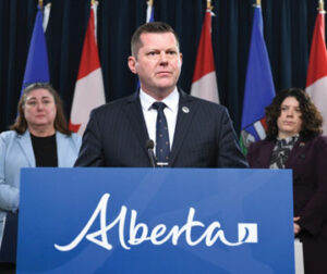 RJ Sigurdson, Minister of Agriculture and Irrigation, is flanked by Leanne Niblock, executive director, Alberta Society for the Prevention of Cruelty to Animals, and Megan Bergman, registrar, Alberta Veterinary Medical Association.--PHOTO COURTESY ALBERTA GOVERNMENT