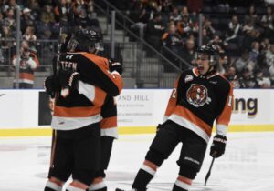 Medicine Hat Tigers forward Liam Ruck celebrates Riley Steen's first WHL goal in a 5-0 win over the Portland Winterhawks at Co-op Place on October. 11. Liam and Markus Ruck are two of nine Tigers' named to the NHL Central Scouting's preliminary player to watch list for the 2026 NHL Draft.