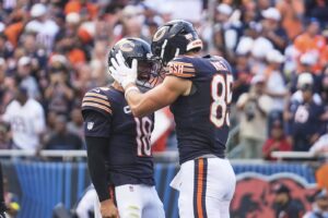 Cole Kmet caught a 10-yard touchdown pass near the end of the first half. DJ Moore made it 31-14 with a 4-yard TD reception in the third quarter, capping 19-play drive that ate up 9:54.