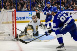 Tampa Bay twice appeared to have a go-ahead goal, but the first was waived off because it hit referee Frederick L’Ecuyer and ricocheted into the net. Kucherov scored with 6:40 left in the third, but Vegas challenged for offside on the entry play and the goal was taken off the board.