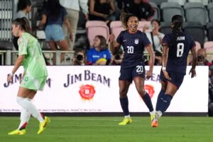 Jaedyn Shaw added a second goal before halftime, taking a pass from Alyssa Thompson before squaring up and calmly finishing out of Durante’s reach to make it 2-0.