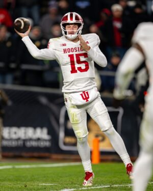 Quarterback Fernando Mendoza’s first scholarship offer came from Yale. He eventually landed at California before joining the Hoosiers this season so he could learn how to become a more complete quarterback by playing for Cignetti. Mendoza now leads the nation with 32 TD passes, is second in passing efficiency and is a Heisman frontrunner.
