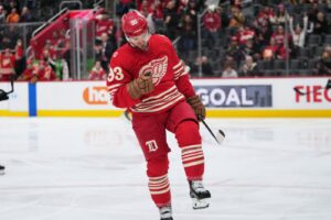 The Red Wings took a 2-0 lead in the first period. Van Riemsdyk scored on a breakaway off a lead pass from Albert Johansson. Seider scored from the point with 6:11 left, with his shot sneaking in between the post and Swayman’s stick.