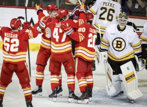On Calgary’s overtime power play, Wolf was forced to make big short-handed stops on Pavel Zacha and then Nikita Zadorov. When the play turned up ice, Calgary’s power play unit was able to set up and Zary banged in a loose puck from in front.