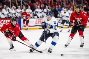 Beaudoin made it 5-3 with under three minutes to go before the intermission, but the Finns, who picked up a chippy 6-3 victory over Canada in a July exhibition game, responded 35 seconds later when Vesterinen jumped on a Keaton Verhoeff turnover and roofed his shot past George’s right ear.