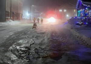 Photos posted to social media show water flooding onto Dawson’s snow-covered road lined by its colourful old-style buildings, some of which date back to the gold-rush era.