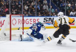 Malkin and Kindel made it 2-0 with goals 3:17 apart in the second period. Malkin opened the scoring by taking a pretty pass from Thomas Novak that went over a Canuck defender’s stick, then beat Lankinen. Kindel made it 2-0 by directing in a shot from defenceman Ryan Shea. Before the period ended Kindel ripped a shot from the faceoff circle past Lankinen.