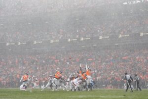 Jarrett Stidham, filling in for an injured Bo Nix, and Drake Maye, an NFL MVP candidate, both struggled in the weather. Stidham threw a TD pass but also fumbled deep in Denver territory that set up New England’s TD.