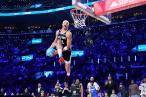 Three-time dunk winner Mac McClung — currently on a two-way contract with the Chicago Bulls — didn’t participate. He was the only competitor in history to have a perfect contest, scoring 50s from every judge on all of his dunks last year in San Francisco.