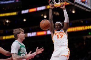 ATLANTA (AP) — Onyeka Okongwu and Jalen Johnson each scored 20 points, and three days after losing to the Celtics on the road, the Hawks responded with a 112-102 win over Boston on Monday night. It was Atlanta’s 13th consecutive home win.